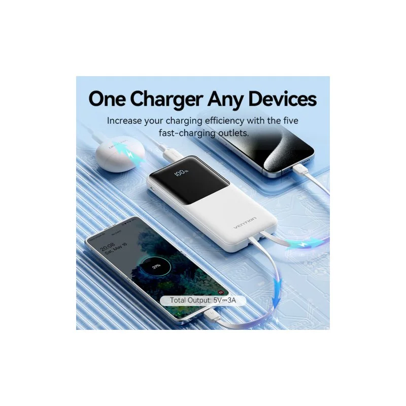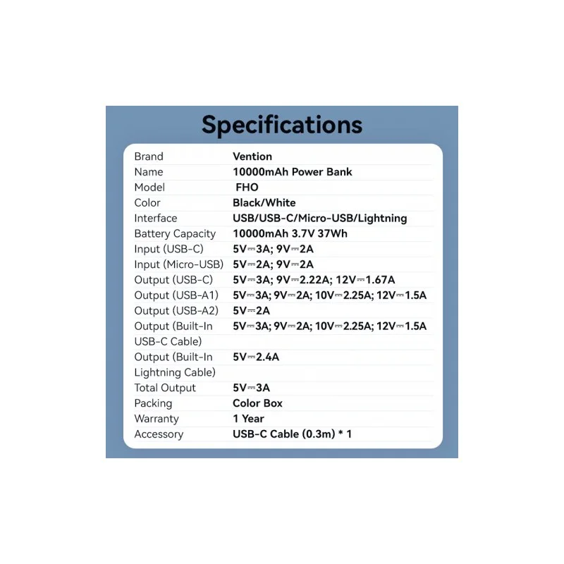 Портативный аккумулятор Vention FHOB0— это удобный и надёжный Power Bank с продуманной функциональностью и лаконичным дизайном. Компактный корпус с матовой поверхностью и встроенными кабелями делает его идеальным спутником в повседневной жизни, поездках и командировках.
