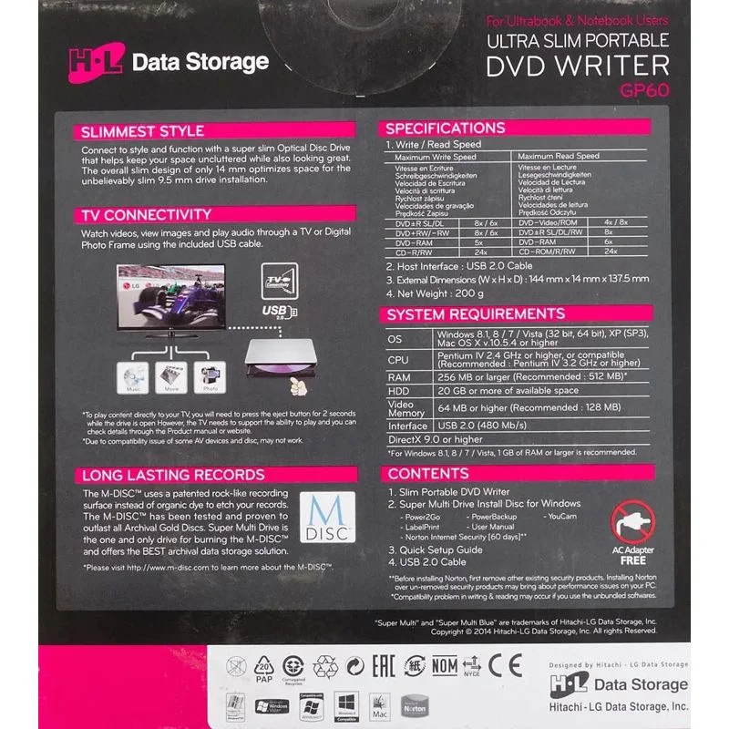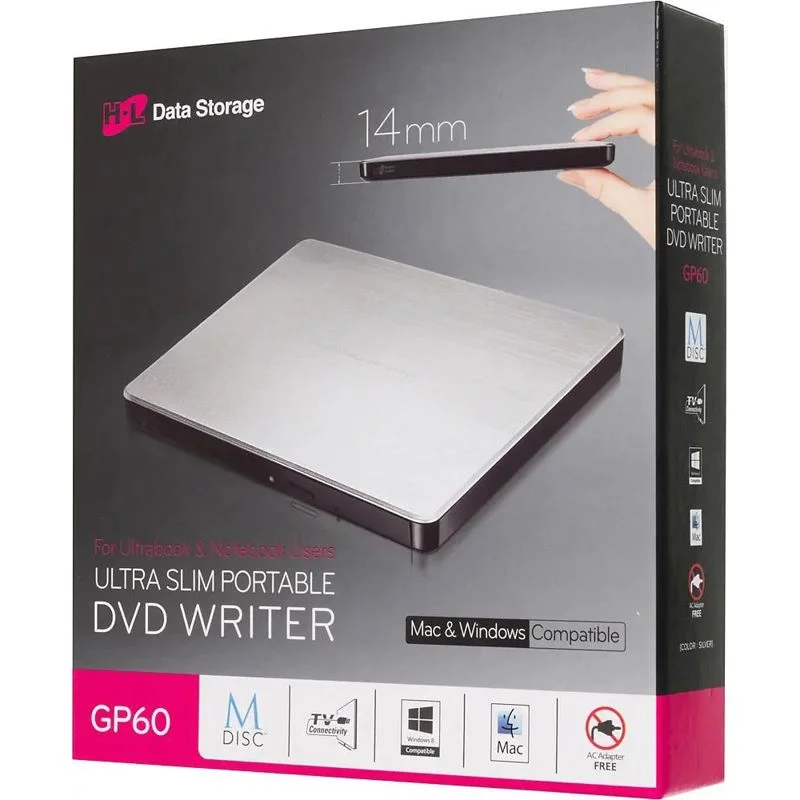 Совместимость с операционными системами: внешний привод LG DVD-RW GP60NS60.AUAE12S совместим с операционными системами Windows и Mac OS.