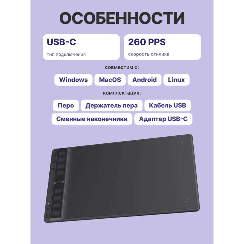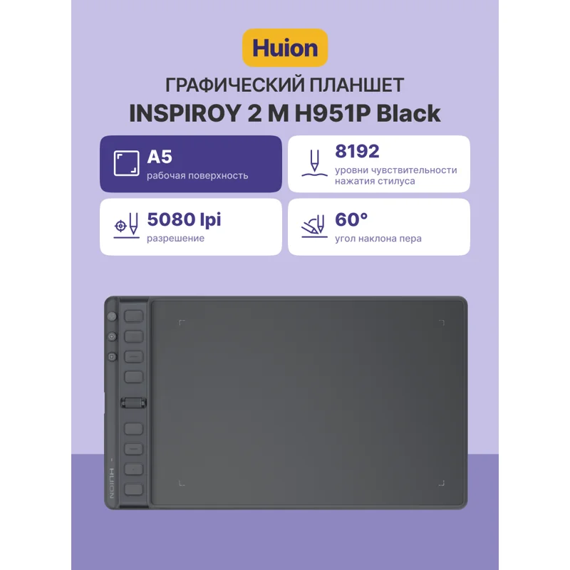 Графический планшет Huion Inspiroy 2 M H951P поддерживает как работу с ПК, так и с мобильными телефонами и планшетами. Небольшие размеры и вес позволяют использовать планшет как портативное устройство для рисования. Планшет легко подключается к ПК либо мобильному телефону по интерфейсу USB-C.