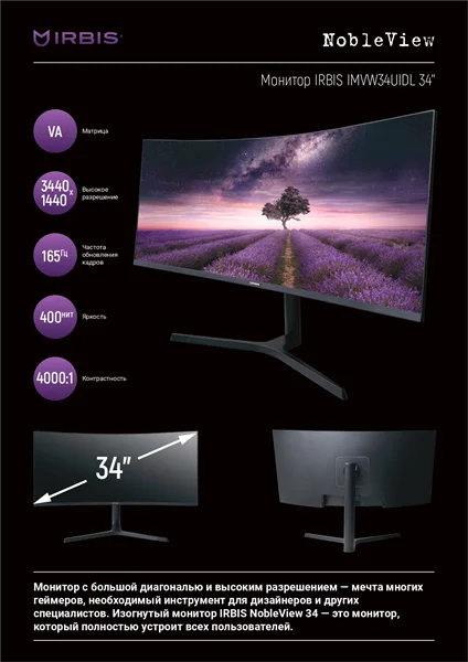 Монитор 34'' IRBIS NOBLEVIEW 34 LED Monitor Curved 3440x1440, 21:9, VA, 400 cd/m2, 4000:1, 3ms, HDMI, DP USB-C(65W) USB-Ax2 USB-B 165Hz Speak Tilt Height Swivel внешн. Бп VESA Black 3y (China)