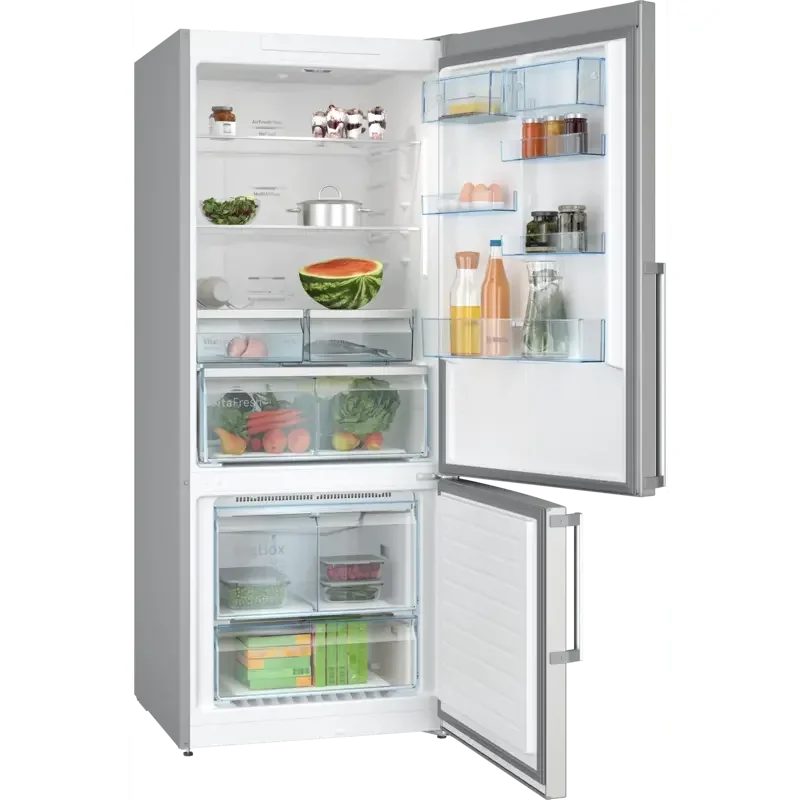 Холодильник BOSCH KGN76CI30U Full NoFrost обладает впечатляющими габаритами 186x75x80 см и общим полезным объемом 521 литр, из которых 406 литров приходится на холодильное отделение и 115 литров на морозильное. Он выполнен из нержавеющей стали с легкой очисткой, что делает уход за ним простым и удобным. Цифровой LCD-дисплей и внешние высокие металлические ручки добавляют элегантности и удобства в использовании.