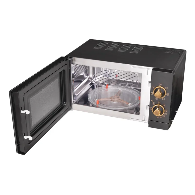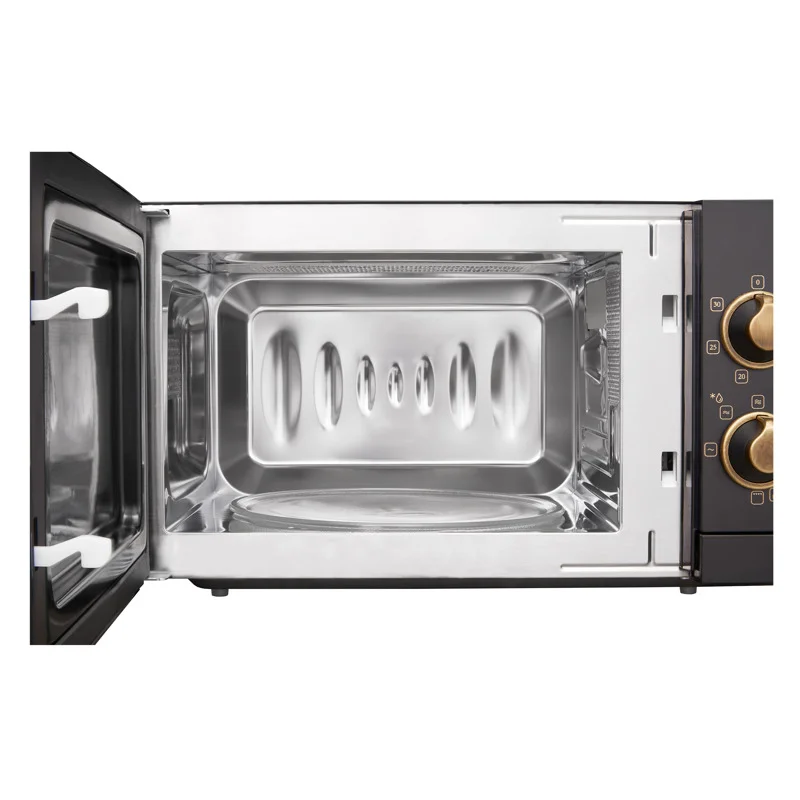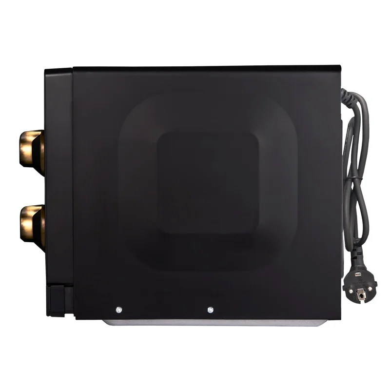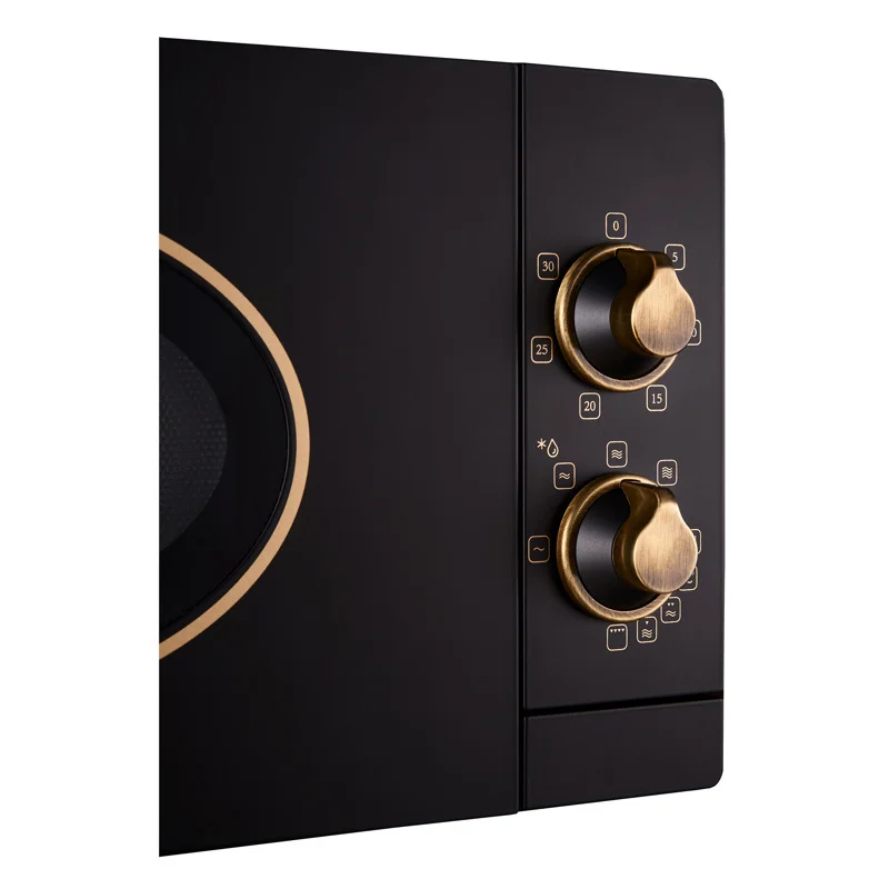 Микроволновая печь KORTING выделяется своим уникальным ретро-дизайном, который придает кухне особый шарм и уют. Черный цвет с бронзовыми элементами создает элегантный и стильный вид, который organically впишется в любой интерьер.