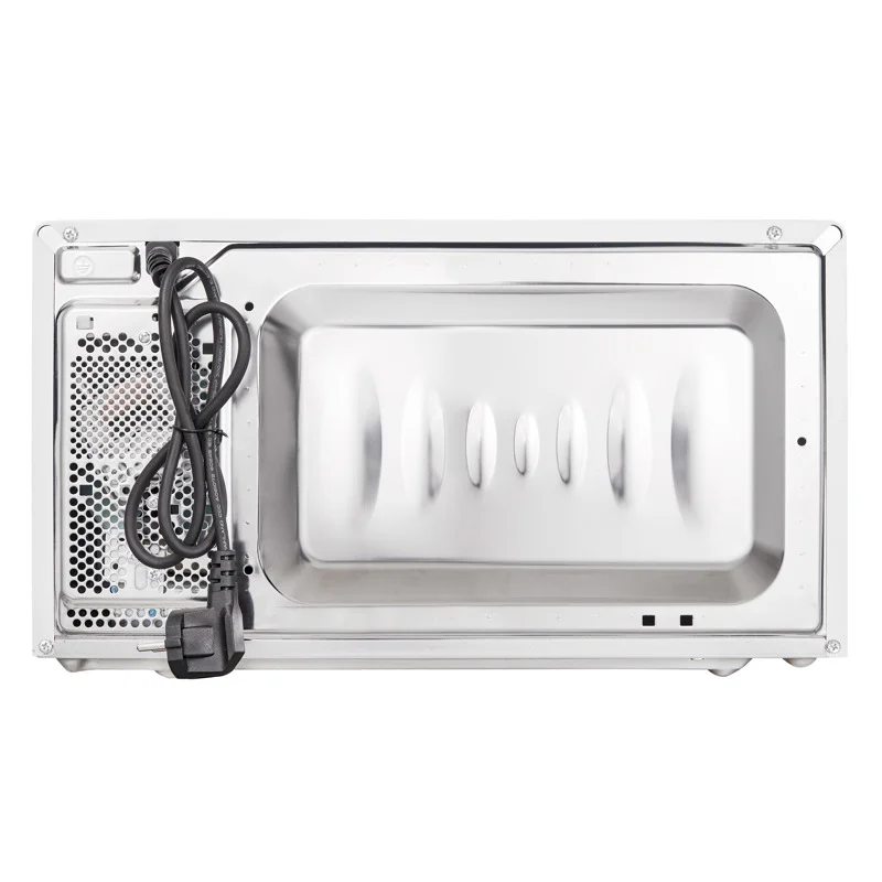 Внутренняя камера оборудована поверхностью из нержавеющей стали, устойчивой к повреждениям. Поворотный стол диаметром 245 миллиметров даёт возможность использовать посуду различных размеров. Система освещения позволяет контролировать процесс приготовления.