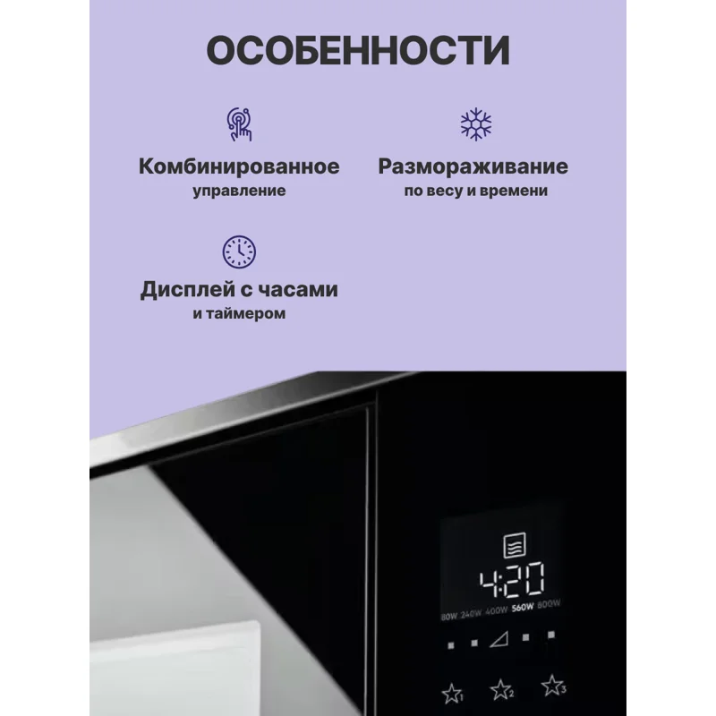 Механическое управление делает работу с прибором максимально простым и понятным, что особенно важно для пожилых пользователей или тех, кто ценит надежность без лишних сложностей. Автоматическая разморозка — одна из ключевых функций, которая позволяет легко и быстро разморозить продукты без необходимости постоянного контроля. Внутреннее освещение помогает следить за процессом приготовления, видеть состояние блюда и при необходимости корректировать время или режим работы.