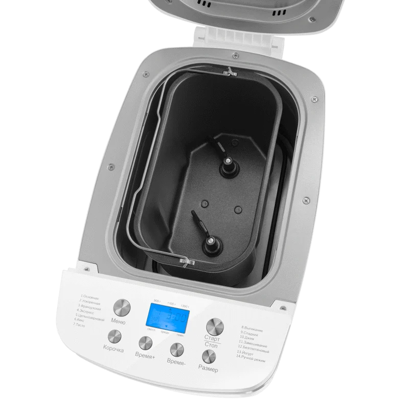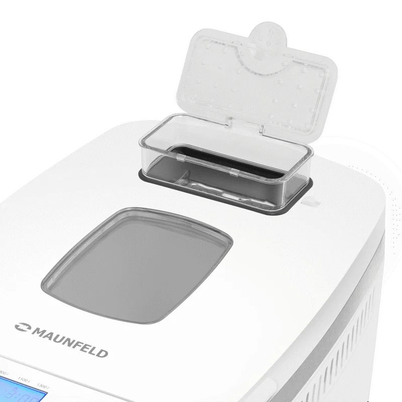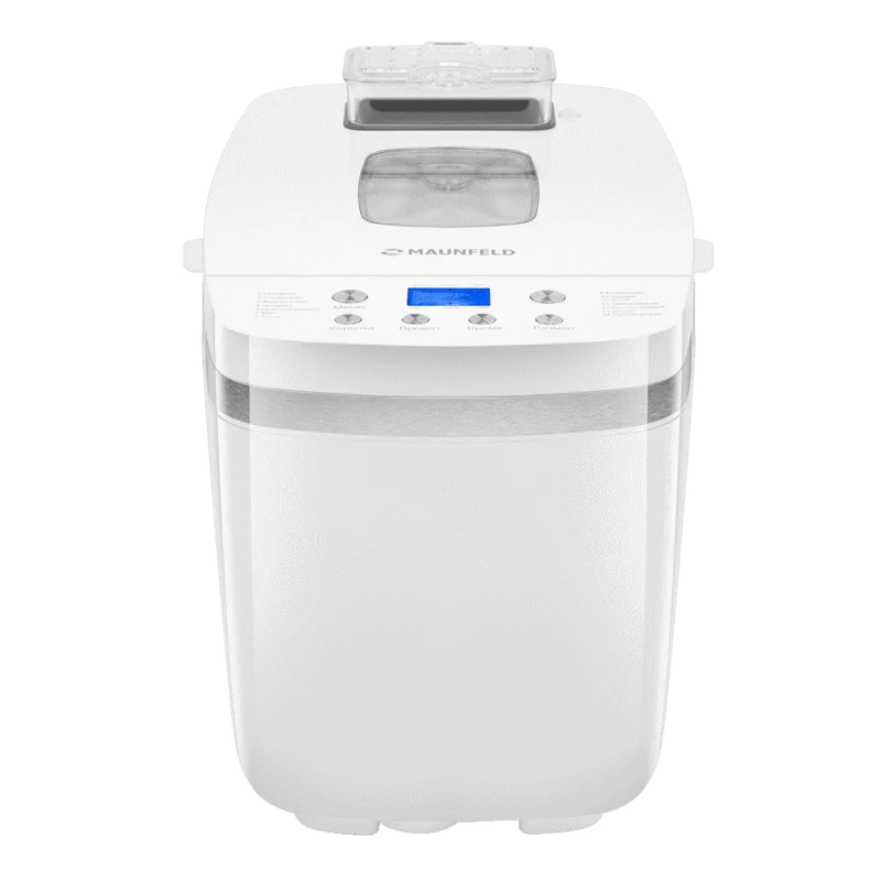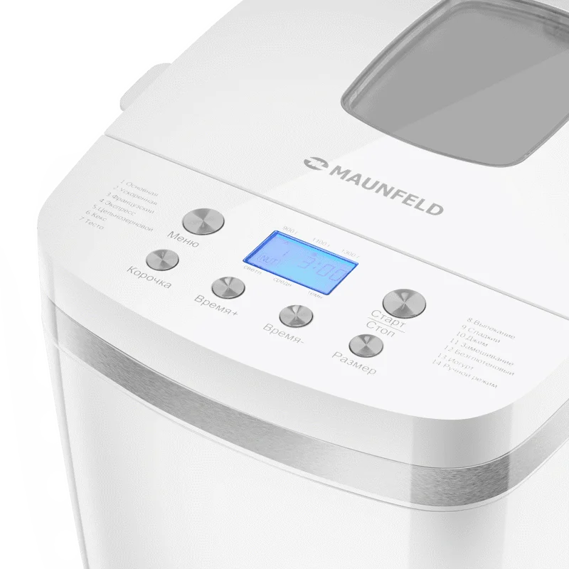 Хлебопечь Maunfeld MBM-1300DPW оснащена панелью с функциональными кнопками. Удобный дисплей, отображающий все текущие настройки. Список встроенных программ всегда на виду. 14 автоматических режимов помогут приготовить хлеб по рецептам со всего мира. Хлебопечь оснащена удобным диспенсером - начинка автоматически будет добавлена в тесто на нужном этапе замеса.