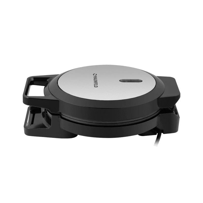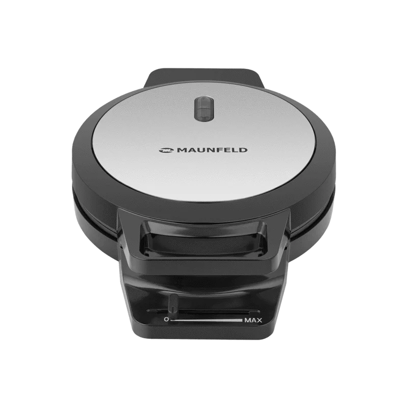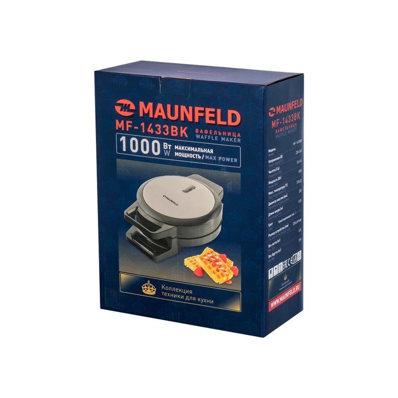 Вафельница MAUNFELD MF-1433BK мощностью 1000 Вт с возможностью одновременного приготовления 5 вафель 9x9 см. Предусмотрены плавный регулятор степени прожарки, индикатор нагрева, ручка из термостойкого пластика и термостат.