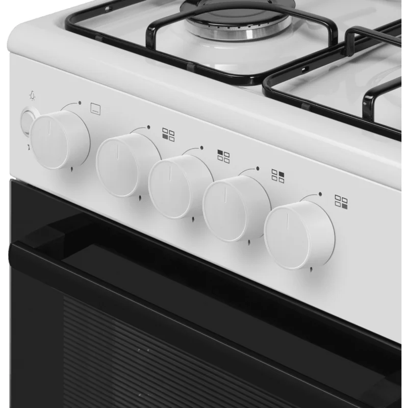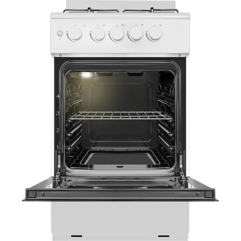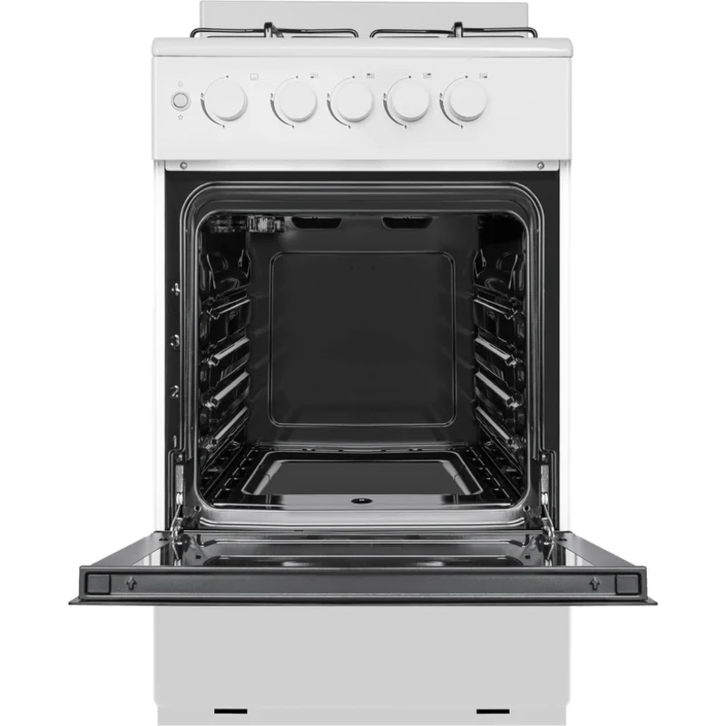 Это классическая отдельностоящая газовая плита в белом цвете. Она подойдет для любой кухни благодаря компактным размерам (ширина 49,5 см) и простому механическому управлению. Основные особенности: 4 газовые конфорки с электроподжигом – зажигаются одним нажатием, газ-контроль духовки автоматически отключает подачу газа, если пламя гаснет, духовка с гидролизной очисткой – легко отмывается после приготовления, внутреннее покрытие духовки из эмали – устойчиво к загрязнениям, подсветка духовки – удобно следить за приготовлением, таймер – можно выставить время готовки, внизу есть ящик для хранения посуды. Эта модель подойдет тем, кто ищет практичную газовую плиту с необходимым набором функций. Она проста в использовании и надежна в работе.