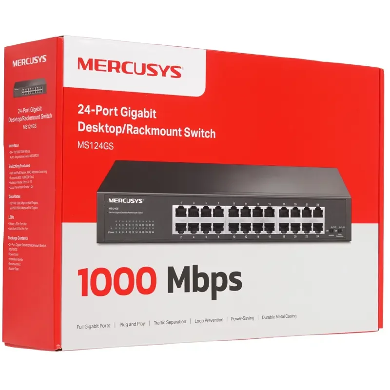 MS124GS Mercusys 24-Port Gigabit Switch — это уникальное сочетание высокой скорости передачи данных и надежного сетевого управления. Эта элегантная модель с металлическим корпусом идеально впишется в офис или серверную комнату.