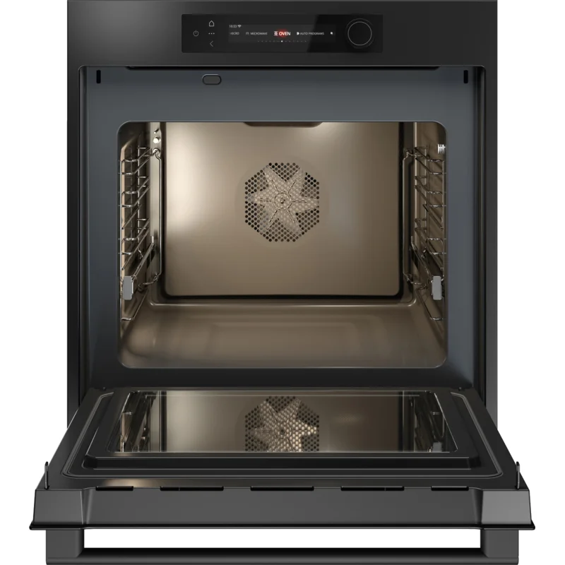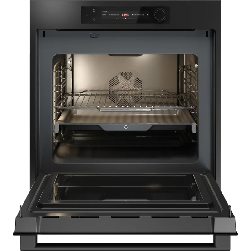 Духовой шкаф Asko OCM66GSH с функцией СВЧ и термощупом предназначен для встраивания в кухонную мебель с нишей размерами 590х560х550 мм. Фасад прибора оформлен в дизайне NYACraft Frame 2025 года с цельной металлической рамой, которая окружает стеклянную дверцу и интегрирует панель управления. Активное охлаждение защищает корпус и соседнюю мебель от высоких температур. Камера объемом 68 л Камера, покрытая пиролитической эмалью, оснащена пятью уровнями направляющих для противней. Выдвижные телескопические направляющие на первом уровне облегчают установку и извлечение тяжелой посуды. Контроль температуры в камере Нагревательные элементы позволяют быстро достичь установленной температуры в камере (от 30°С до 250°С) и точно поддерживают ее на протяжении всего процесса приготовления. Технология CelsiusCooking позволяет регулировать температуру с точностью до 1°С. Система освещения на боковой стенке Настраиваемая по цвету и интенсивности светодиодная подсветка в боковой части камеры хорошо освещает внутреннее пространство. Интуитивно понятное сенсорное управление Сенсорный экран позволяет выбрать необходимые параметры работы устройства в несколько касаний. TFT-дисплей предоставляет мгновенный доступ к часто устанавливаемым функциям. Управление по Wi-Fi Модуль Wi-Fi позволяет дистанционно управлять работой прибора через приложение ConnectLife. Автоматические программы и более десяти рабочих режимов Устройство поддерживает 116 автопрограмм и более десяти видов кулинарной обработки, включая «Горячий воздух», «Верхний нагрев», «Большой гриль», «Большой гриль и вентилятор». Инверторная СВЧ технология Доступно пять режимов СВЧ: «Микроволны», «Нагрев сверху, снизу, вентилятор и микроволны», «Горячий воздух и микроволны», «Интенсивное запекание и микроволны», «Большой гриль, вентилятор и микроволны». Инверторная технология Stirrer обеспечивает равномерное распределение волн и поддерживает установленную мощность (от 90 до 1000 Вт), повышая качество блюд.