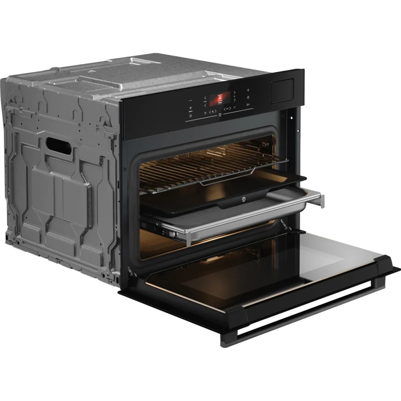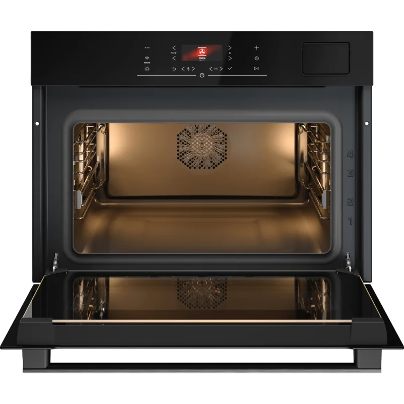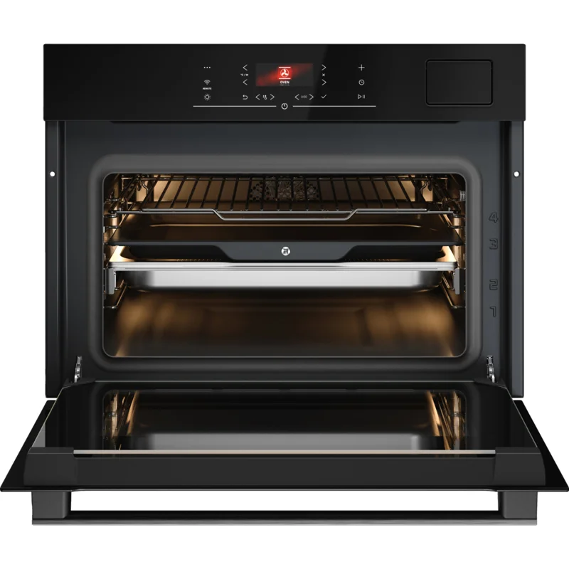 Компактный размер без ущерба функциональности При ширине всего 45 см и полезном объеме 51 литр духовой шкаф оптимально использует ограниченное пространство. Это отличное решение для кухонь-гостиных, дач, планировок с двойным духовым шкафом или небольших семей, которым не требуется габаритная печь, но важны передовые технологии и разнообразие режимов приготовления.