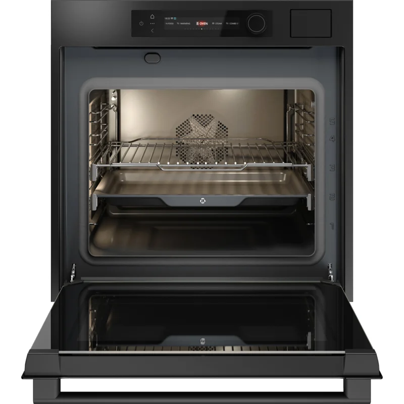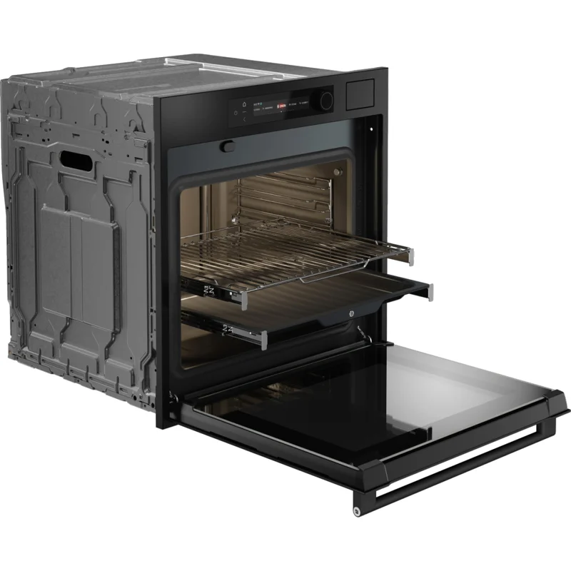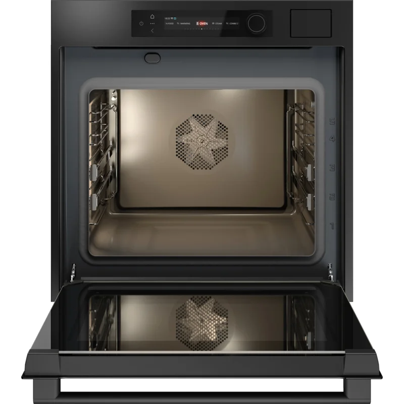 Внутреннее пространство духовки объемом 71 литр оптимизировано для размещения больших форм и противней, оборудовано качественными телесетическими направляющими для двух уровней. Это позволяет одновременно готовить разные блюда, исключив смешивание запахов и вкусов. Освещение рабочей зоны обеспечивается светодиодными лампами (LED) с равномерным распределением света, обеспечивающими комфортное наблюдение за ходом приготовления еды. Дверца духовки плавно открывается и закрывается, устраняя хлопки и рывки. Интеграция с умным домом и возможность удаленного контроля состояния прибора через мобильное приложение по протоколу Wi-Fi значительно повышает удобство пользования устройством. Термозонд контролирует температуру непосредственно внутри продукта, гарантируя достижение оптимального результата независимо от размера и плотности приготавливаемого блюда.
