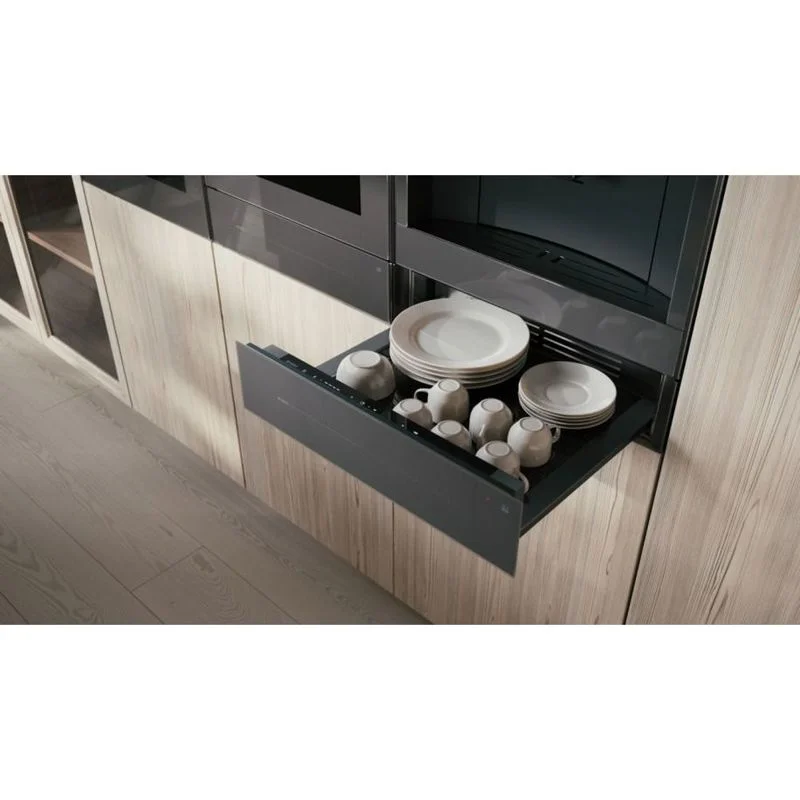 Сенсорное управление и нажимной механизм открывания делают эксплуатацию шкафа максимально простой и удобной. Телескопические направляющие с полным выдвижением облегчают доступ к содержимому и предотвращают опрокидывание посуды. Воздушная циркуляция обеспечивает равномерный нагрев и поддержание температуры.