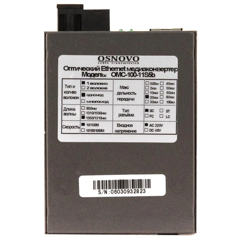 Медиаконвертер OSNOVO OMC-100-11S5b Оптический Fast Ethernet медиаконвертер для передачи Ethernet по одному волокну одномодового оптического кабеля до 20км. Поддерживает скорость 10/100М (IEEE 802.3i, IEEE 802.3u, I
