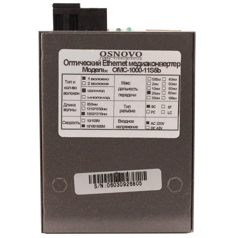 Медиаконвертер OSNOVO OMC-1000-11S5b Оптический Gigabit Ethernet медиаконвертер для передачи Ethernet по одному волокну одномодового оптического кабеля до 20км. Поддерживает скорость 10/100/1000М (IEEE 802.3i, IEEE