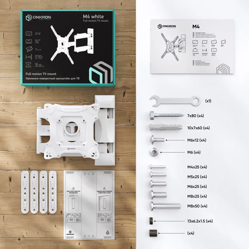 Поставляется с инструкциями и всем необходимым оборудованием, включая набор болтов M8*50, подходящих для телевизоров Samsung и обычно не имеющихся в стандартных монтажных наборах. Наклонно-поворотный кронштейн ONKRON M4 обеспечивает надежную поддержку для больших экранов.