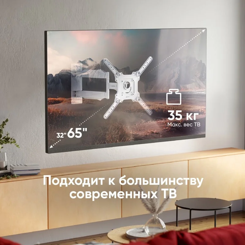 Подходит практически всем современным телевизорам - LCD, LED, OLED, Ultra HD, Plasma, с выгнутыми и плоскими мониторами. Поддерживает стандарты VESA в диапазоне от 100 x 100 мм (мин.) до 400 x 400 мм (макс.).