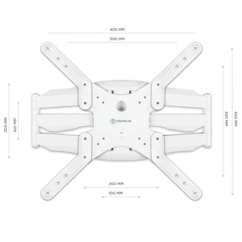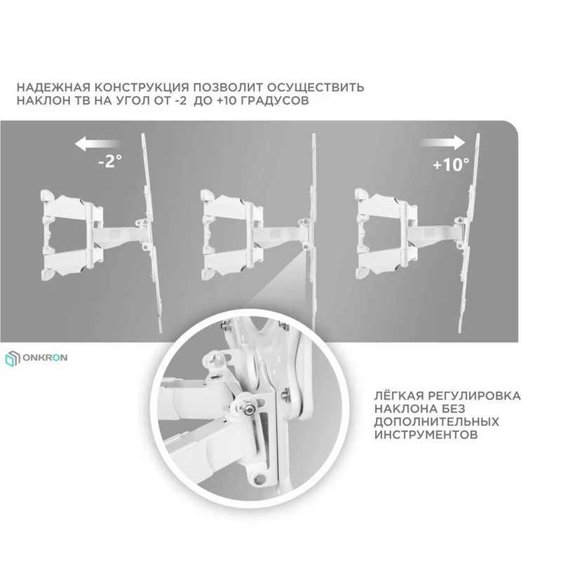 ONKRON M5 обладает широчайшими возможностями наклона и поворота, предусматривает регулировку экрана по вертикали и горизонтали. Крепкий и прочный, при этом элегантный белый кронштейн станет стильным дополнением светлого интерьера.