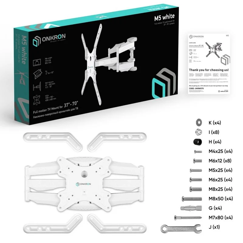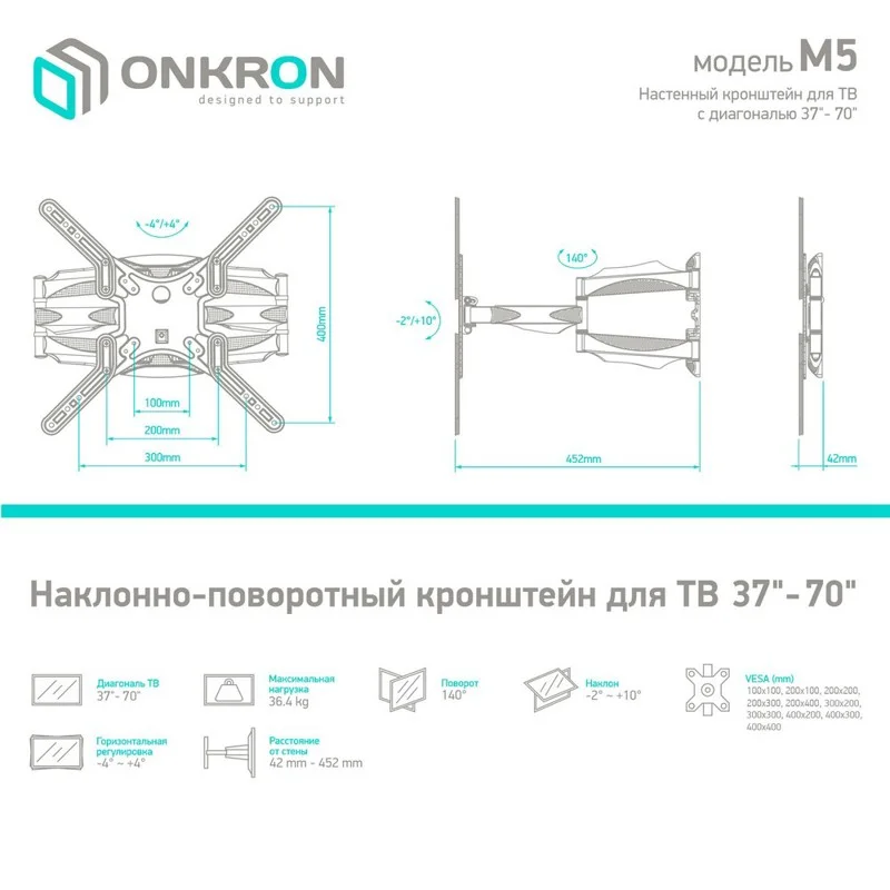 Настенный наклонно-поворотный кронштейн ONKRON M5 в белом цвете предназначен для телевизоров с диагональю от 37 до 70 дюймов. Он отлично подходит для современных digital-панелей с широкой диагональю и небольшим весом. Кронштейн выдерживает до 36,4 кг. Надежное крепление к стене подарит чувство безопасности Вам и Вашим близким. Также кронштейн является одним из самых маневренных в своей категории.