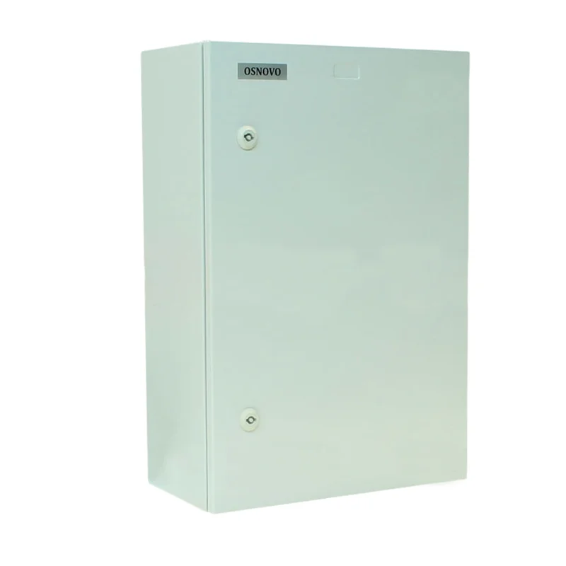 OSNOVO OS-46T1 Уличная станция с термостабилизацией и оптическим кроссом. В основе металлический шкаф с классом защиты IP66. Доступное место под установку оборудования на встроенные DIN-рейки: верхняя