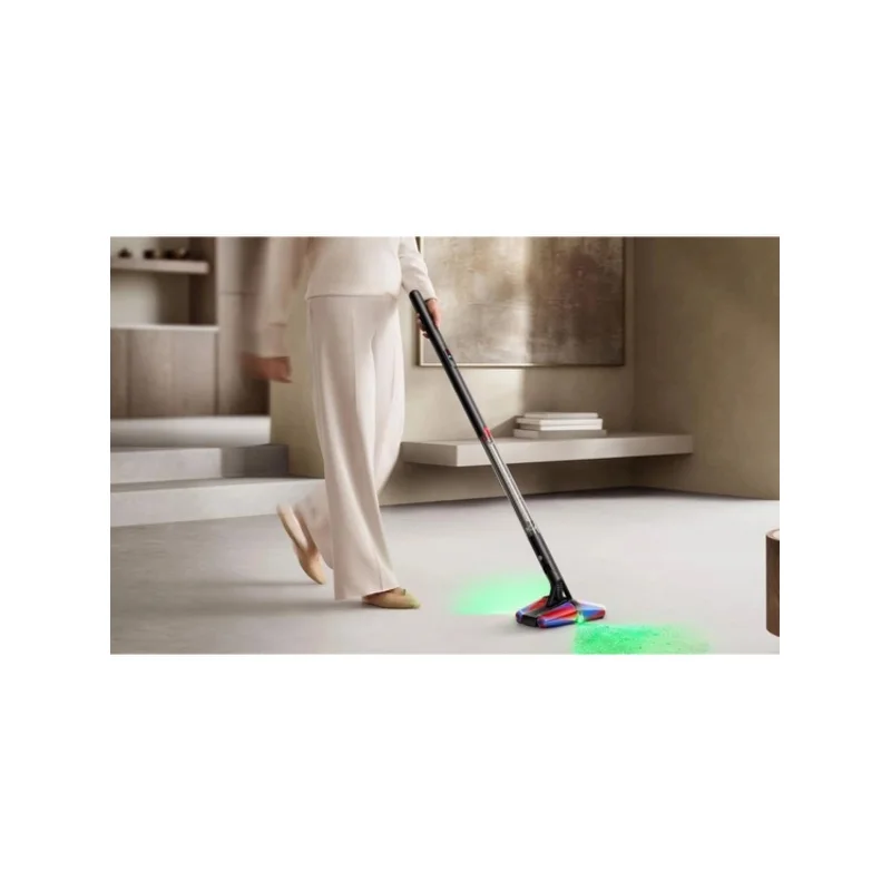 Главной особенностью модели стала уникальная насадка Fluffycones с четырьмя мягкими коническими щётками. Они вращаются в противоположных направлениях, эффективно распутывают и собирают длинные волосы, шерсть и мелкий мусор, не давая им наматываться на вал. Такая конструкция позволяет убирать до самого края плинтуса и обеспечивает идеальную чистоту как при прямом, так и при обратном движении. Пылесос оснащён лазерной подсветкой спереди и сзади: она подсвечивает невидимую пыль на твёрдых покрытиях, гарантируя безупречный результат уборки.