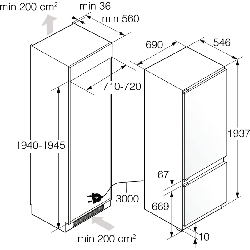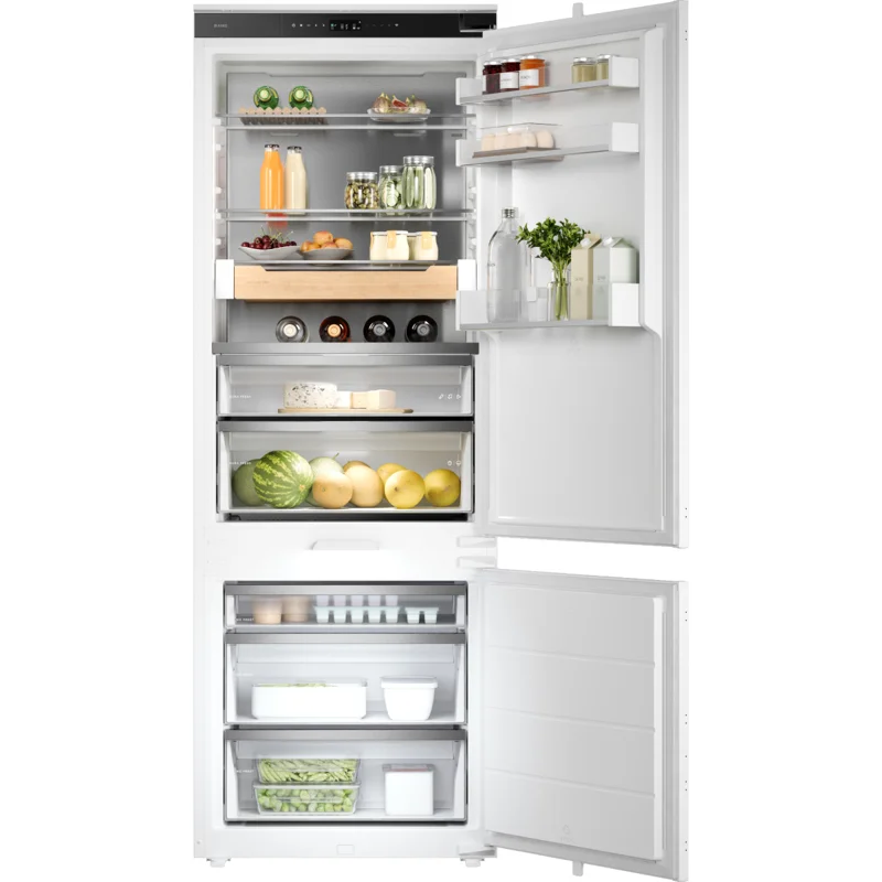 Встраиваемый холодильник Asko RBC597SND1 — это современное и технологичное решение для обустройства кухонного пространства. Модель сочетает в себе элегантный белый цвет, продуманную эргономику и широкий набор функций для длительного сохранения свежести продуктов. Благодаря скользящей системе монтажа и возможности перенавешивания двери этот аппарат легко интегрируется в любой кухонный гарнитур. Умное управление и эффективное охлаждение Настройки устанавливаются с помощью удобного сенсорного интерфейса и цветного TFT-дисплея, что обеспечивает простой и интуитивный доступ ко всем функциям. За поддержание идеального микроклимата отвечает адаптивный температурный контроль и система охлаждения Opti Flow+, которая обеспечивает постоянную циркуляцию холодного воздуха во внутренней камере, поддерживая одинаковую температуру на всех полках. Для повседневных задач и подготовки к закупкам полезны режимы Super Cool для быстрого охлаждения продуктов и Fast Freeze для их эффективного замораживания. Продуманная организация пространства Холодильное отделение объемом 266 л снабжено четырьмя стеклянными полками, тремя дверными балконами, включая полку для бутылок, и двумя ящиками в зоне свежести DuraFresh. В последней автоматически поддерживается оптимальный уровень влажности для разных категорий товаров: в «сухом» ящике лучше хранить мясо и рыбу, а во «влажном» — овощи и фрукты. Надежность и практичность Нижнее расположение морозильной камеры вместимостью 104 л делает использование холодильника еще более удобным. Система No Frost как в обоих отделениях избавляет от необходимости ручного размораживания, а лед и иней не образуются на стенках. Звуковой и световой сигналы оповещают о неплотно закрытой дверце или повышении температуры внутри прибора. Энергоэффективность и низкий уровень шума 35 дБ делают эту модель экономной и комфортной в эксплуатации.