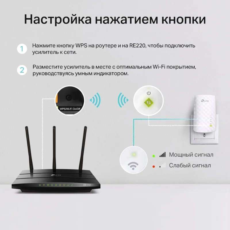 TP‑Link RE220 — компактная точка доступа‑репитер, которая устраняет мёртвые зоны и делает Wi‑Fi стабильным в труднодоступных местах. Устройство просто ставится в розетку или крепится на стену и быстро расширяет покрытие уже существующей сети. Это практичный способ расширить зону покрытия Wi‑Fi, повысить стабильность соединения и подключить проводные устройства через Ethernet. Прост в установке и совместим с большинством домашних сетей.