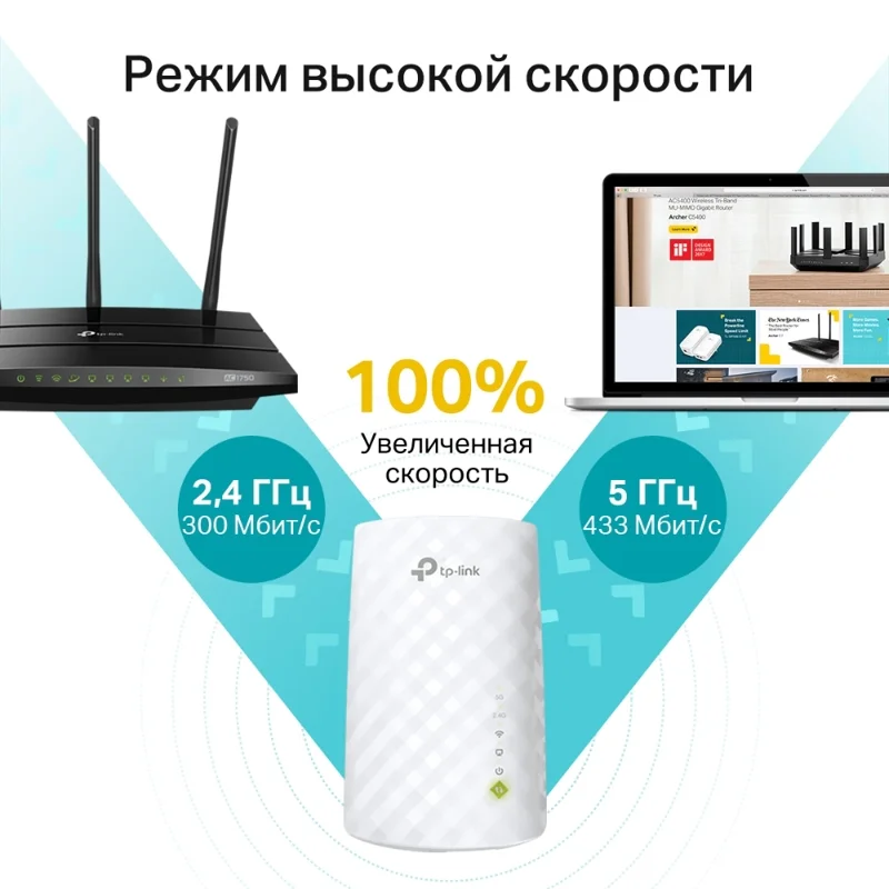 Точка доступа TP‑Link RE220 поддерживает два диапазона, 2,4 ГГц и 5 ГГц, что даёт гибкость в выборе канала и позволяет снизить помехи в загруженных сетях. Максимальная суммарная скорость достигает до 750 Мбит/с — достаточно для потокового видео, видеозвонков и онлайн‑работы на нескольких устройствах одновременно.