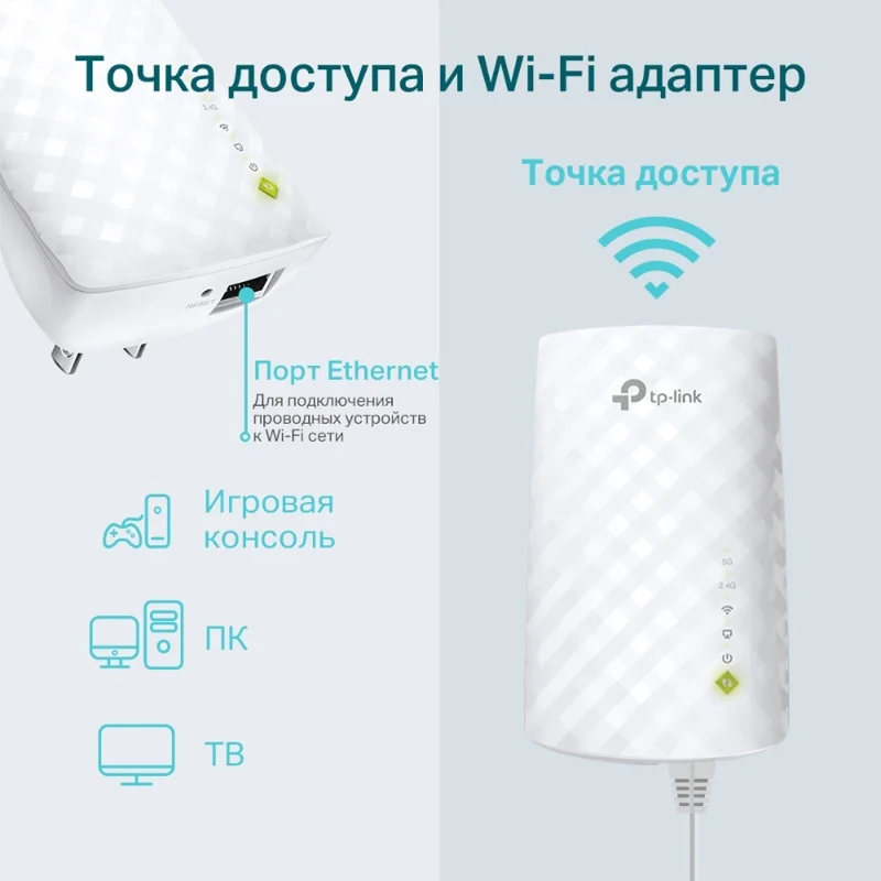 На корпусе TP‑Link RE220 есть Ethernet‑порт, который позволяет использовать RE220 как беспроводной адаптер для проводных устройств — ТВ, приставок или компьютеров без Wi‑Fi.