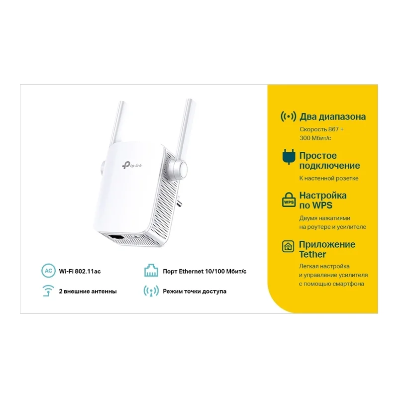 Усилитель работает в двух частотах: 2,4 ГГц и 5 ГГц. Это даёт до 300 Мбит/с на 2,4 ГГц и до 867 Мбит/с на 5 ГГц, что достаточно для просмотра видео, онлайн‑игр и видеозвонков одновременно.