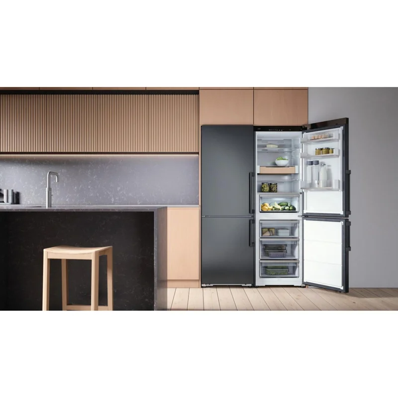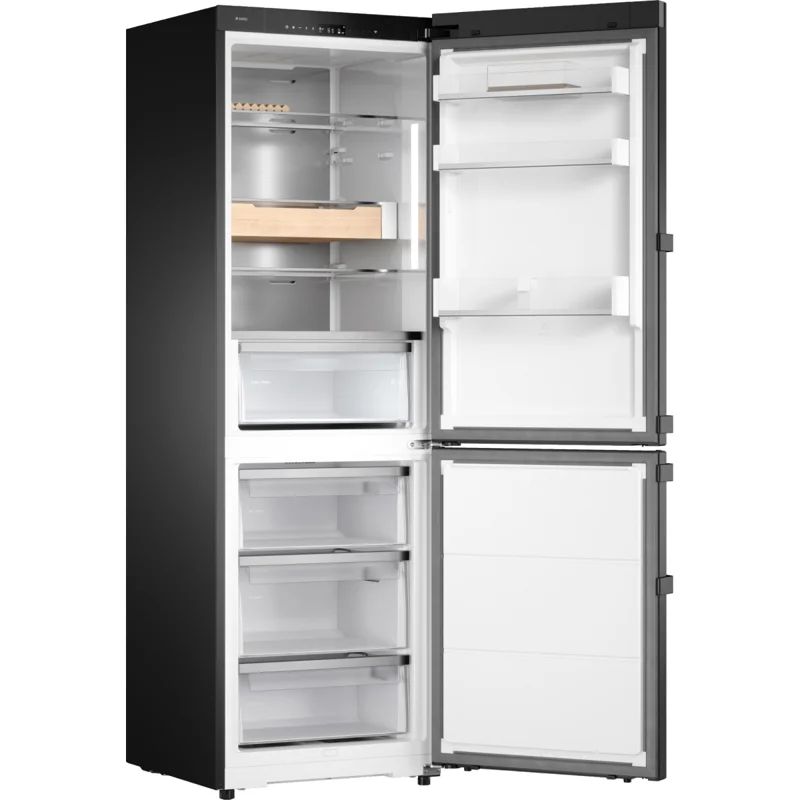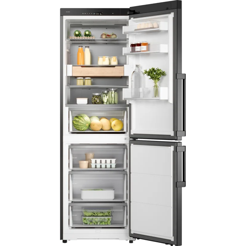 Холодильник Asko RFC586KNBB1 обеспечит безупречную свежесть продуктов. Отдельностоящая модель в черном цвете станет стильным и надежным помощником на любой современной кухне. Металлическая задняя стенка отвечает за поддержание оптимальной температуры в верхнем отделении и предохраняет от размножения бактерий. В комплект входят ящик, бутылочная полочка из натурального дерева и фиксатор для яиц. Умное управление и дисплей Настройки выбираются с помощью цветного сенсорного TFT-экрана. С его помощью легко контролировать температурные режимы, активировать опции Super Cool или Fast Freeze для оперативного охлаждения или заморозки свежих продуктов. Адаптивная система контроля температуры самостоятельно регулирует охлаждение, учитывая загрузку холодильника и температуру в помещении, что способствует экономии электроэнергии и оптимальному микроклимату для продуктов. Передовая система охлаждения Благодаря технологии Opti Flow+ в холодильном отделении через множество вентиляционных отверстий холодные потоки циркулируют максимально равномерно по всему пространству. В обоих отсеках используется система No Frost, которая предохраняет от образования наледи, поэтому вручную размораживать прибор не нужно. Зона DuraFresh Предназначена для создания микроклимата, необходимого для сохранения свежести разных типов продуктов. Она включает «сухой» ящик для рыбы и мяса, а также «влажный» отсек, который идеально подходит для фруктов и овощей. Автоматическая система самостоятельно выпускает излишки влаги или удерживает необходимое ее количество, чтобы продукты оставались свежими и полезными значительно дольше. Эффективность и практичность Морозильное отделение, расположенное в нижней части холодильника, обладает полезным объемом 106 л и состоит из трех ящиков. Производительность достигает 10 кг в сутки. Высокий класс энергопотребления A++ устройству присвоен за низкий расход электричества (не более 295 кВт*ч в год). Холодильник работает очень тихо — уровень шума не превышает 34 дБ. Предусмотрена звуковая и световая сигнализация, оповещающая об открытой двери или повышении температуры внутри камер.