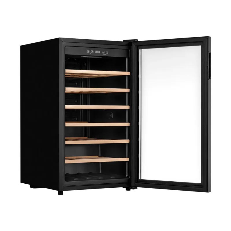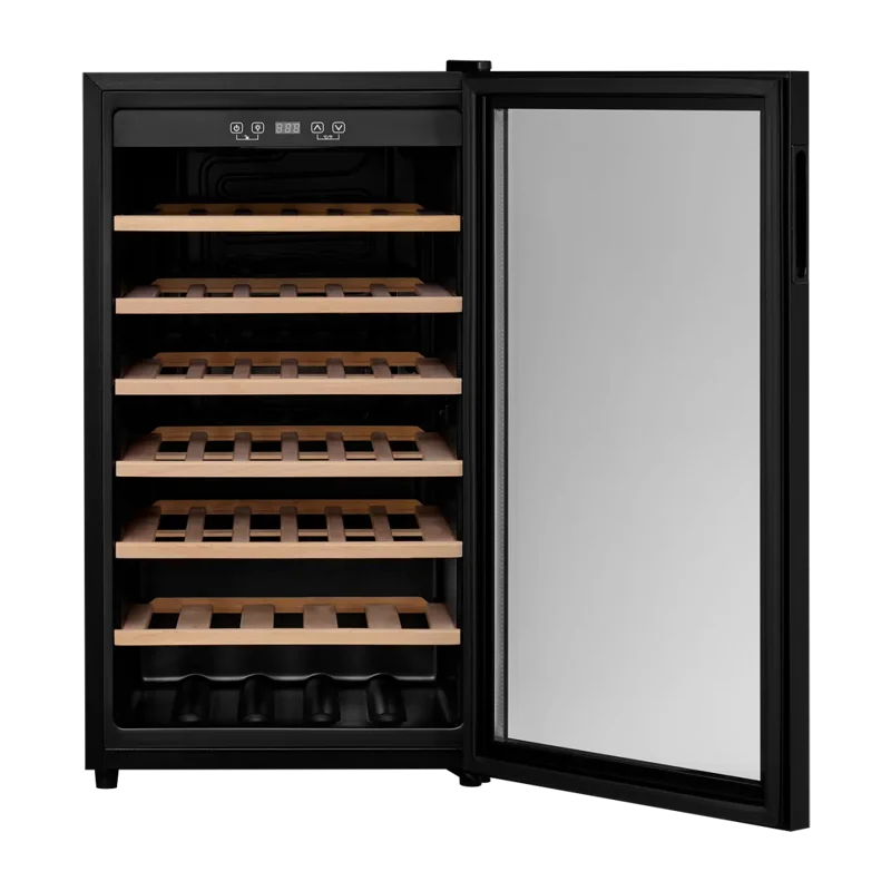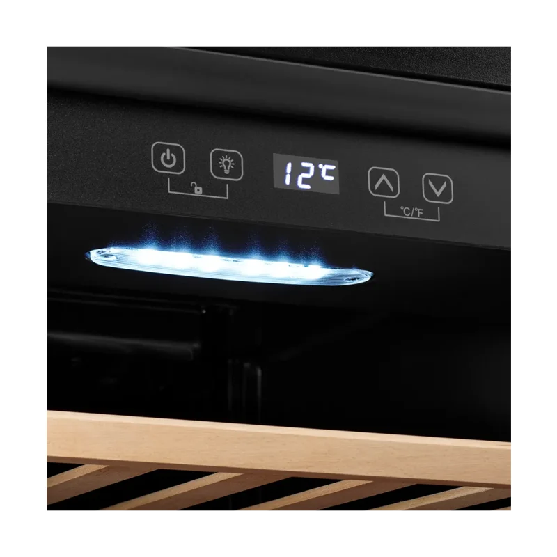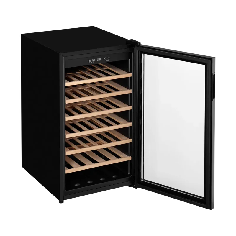 Шкаф оснащён шестью полками из натурального бука, которые обеспечивают надёжное размещение бутылок. Механическое открытие двери делает использование максимально удобным.