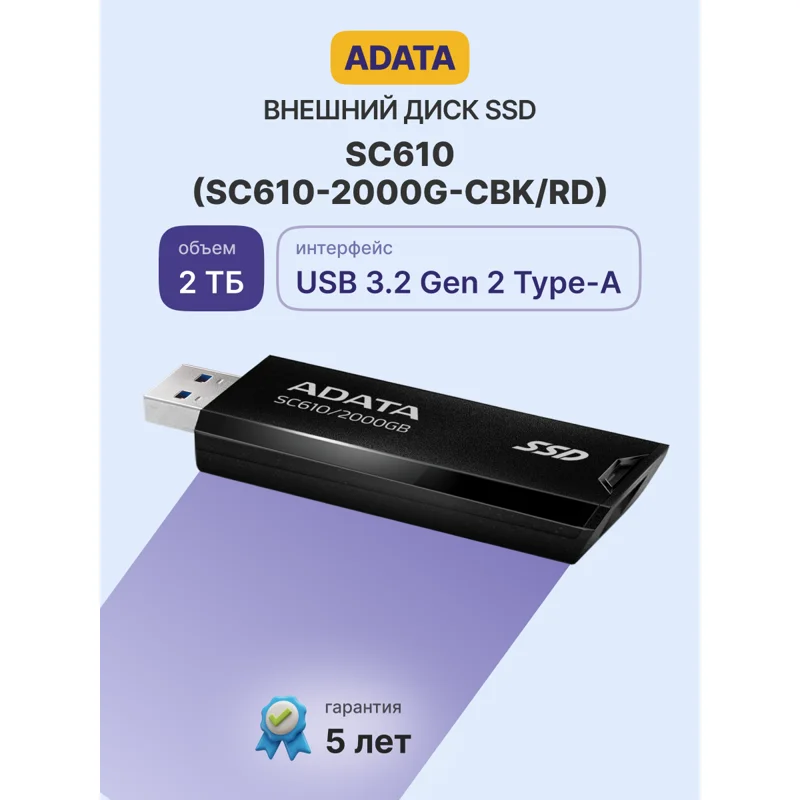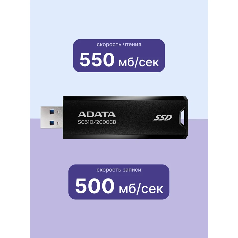 Внешний твердотельный накопитель ADATA External SSD SC610 - надежное и быстрое устройство для хранения данных, которое обеспечит Вам большой объем памяти и высокую скорость работы. Вы можете хранить на нем все свои важные данные и файлы, зная, что они будут в безопасности и всегда под рукой. Идеально подходит для тех, кто ценит надежность и производительность.