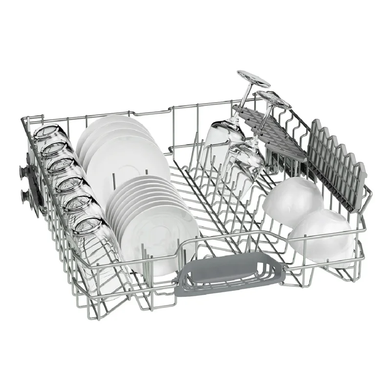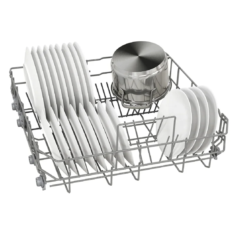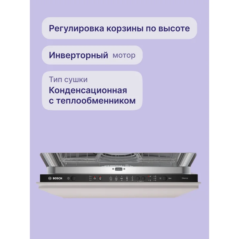 Посудомоечная машина BOSCH SMV25EX02E Series 2 SilencePlus обладает габаритами 81,5х59,8х55 см и вмещает до 13 комплектов посуды. Она размещается на трех уровнях: кроме двух основных коробов, предусмотрен отдельный лоток VarioDrawer для столовых приборов. Вода подается с пяти уровней, что обеспечивает равномерный охват всего внутреннего пространства и высокое качество мойки класса А. Верхний короб можно регулировать по высоте, что позволит разместить «крупногабаритную» посуду.