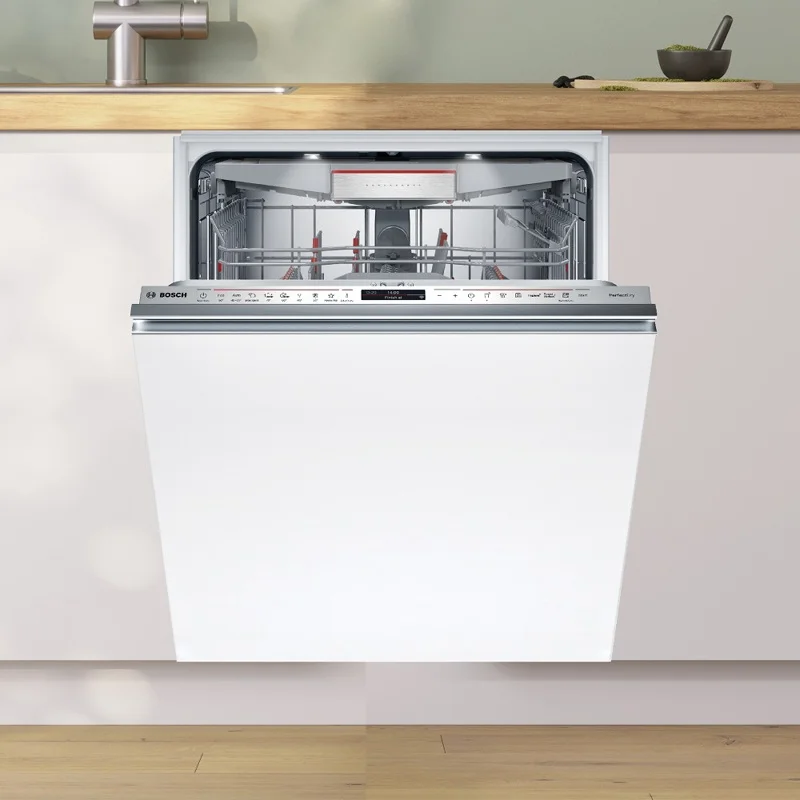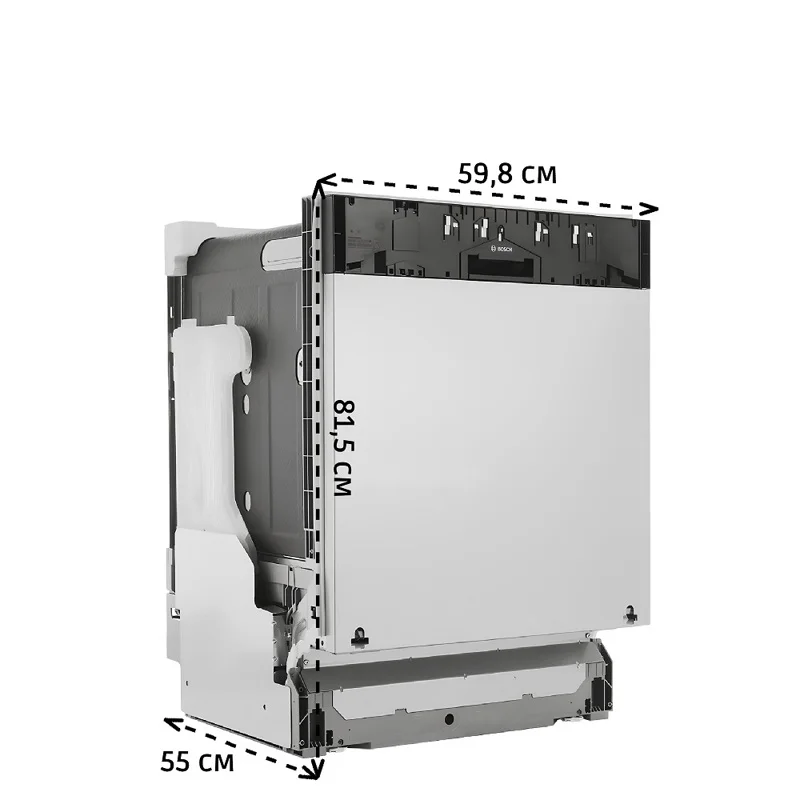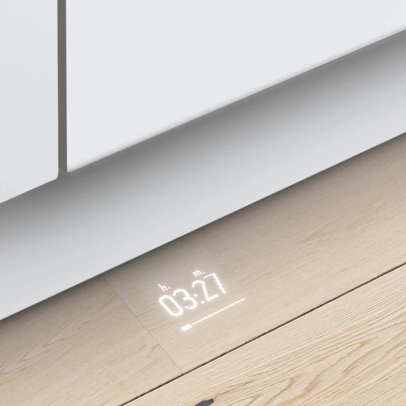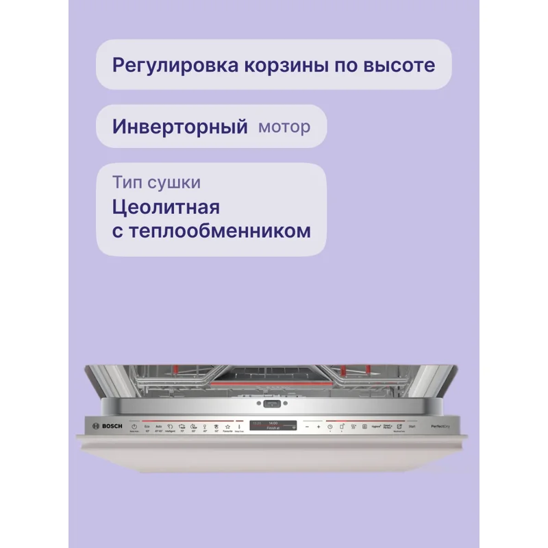 Это премиальная модель шириной 59,8 см, предназначенная для встраивания в кухонный гарнитур. Она рассчитана на 14 комплектов посуды, оснащена сенсорным управлением и 8 программами мойки, включая автоматические и специализированные режимы. Корпус выполнен из нержавеющей стали, а сушка сочетает теплообменник и цеолитную технологию для идеального результата. Дополнительно машина оснащена проекцией дисплея на пол (TimeLight), что позволяет контролировать процесс без открывания дверцы.