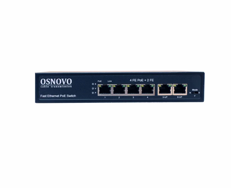 OSNOVO SW-20600(80W) PoE коммутатор Fast Ethernet на 6 RJ45 портов. Порты: 1 x FE (10/100Base-T) с PoE (до 60W, A+B) + 3 x FE (10/100Base-T) с PoE (до 30W), 2 x FE (10/100 Base-T) Uplink. Соответствуе