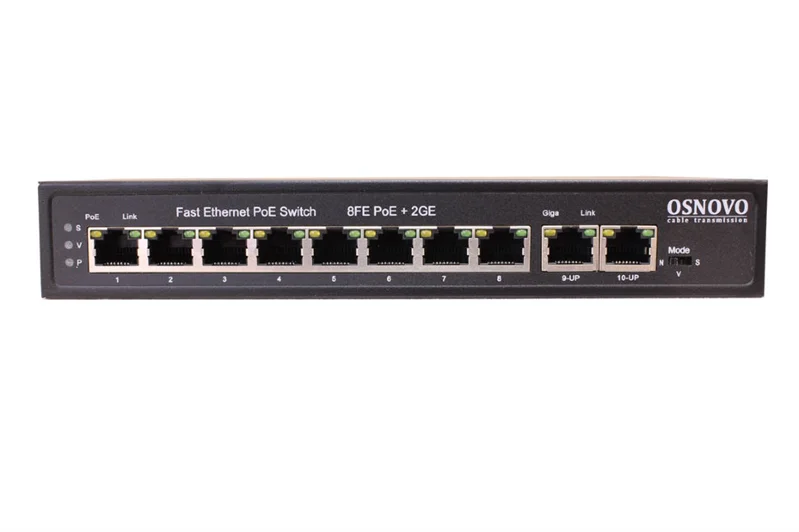 OSNOVO SW-20820(120W) PoE коммутатор Fast Ethernet на 10 RJ45 портов. Порты: 1 x FE (10/100Base-T) с PoE (до 60W, A+B) + 7 x FE (10/100Base-T) с PoE (до 30W), 2 x GE (10/100/1000 Base-T). Соответствуе
