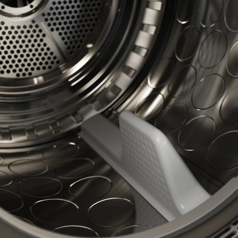 Корпус цвета нержавеющей стали с темной дизайнерской отделкой и барабаном объемом 145 л, выполнен из нержавеющей стали. Семнадцать автоматических программ управления контролируют температуру подачи воды, степень просушки чистого белья (экстра сухая, нормальная, под глажку), текстуру тканей и режим времени.