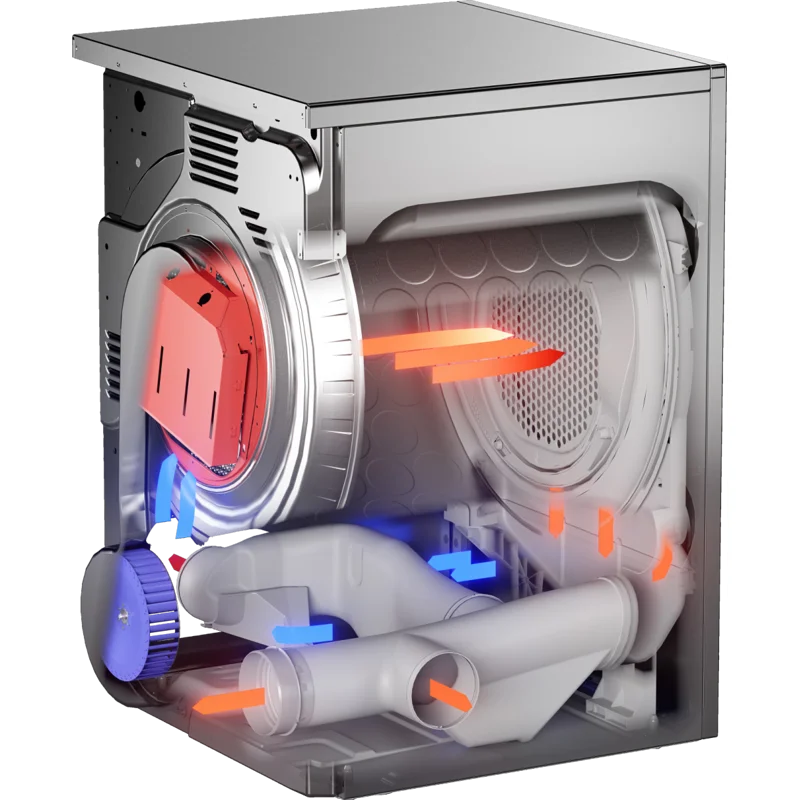 В сушильной машине используется вентиляционный тип сушки, когда влажный воздух выводится наружу из помещения через систему вентиляции - такая конструкция является наиболее простой и надежной. Максимальный вес загрузки составляет 8 кг белья. В числе автоматических программ имеются три программы сушки за 40, 60 и 80 минут, а также отдельная программа проветривания за 60 минут. В дверце располагается фильтр, задерживающий ворс и другой мусор: благодаря ему ворс не попадает в конденсатор и вентилятор. Фильтр можно промывать в проточной воде: о необходимости очистки напоминает индикатор на дисплее.