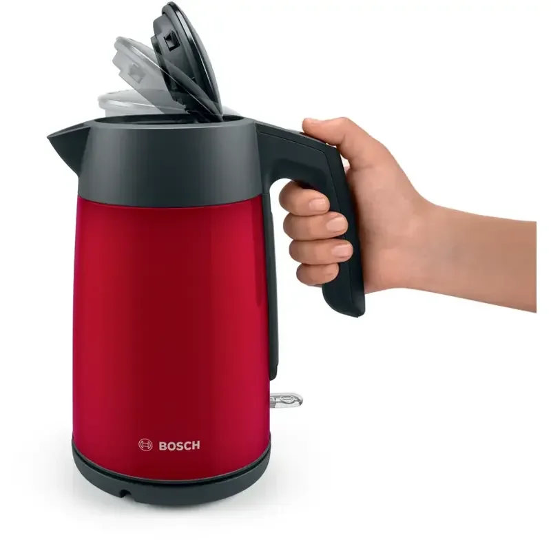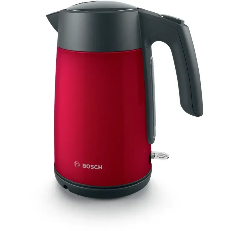 Электрический чайник BOSCH TWK7L464 имеет корпус красного цвета, изготовленный из высококачественной нержавеющей стали, что делает его долговечным.