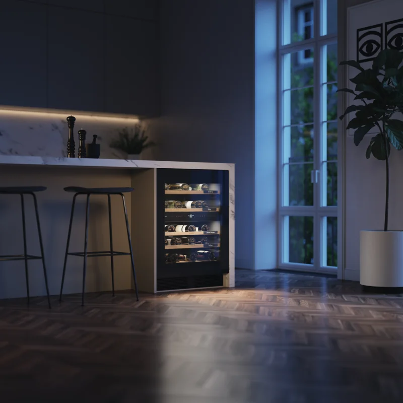 Встроенное LED-освещение не только подсвечивает бутылки, создавая эффектную презентацию коллекции, но и позволяет легко находить нужный напиток. Освещение можно регулировать, создавая атмосферу в зависимости от настроения.