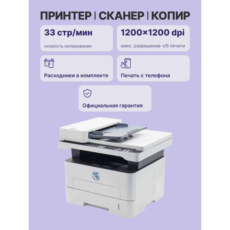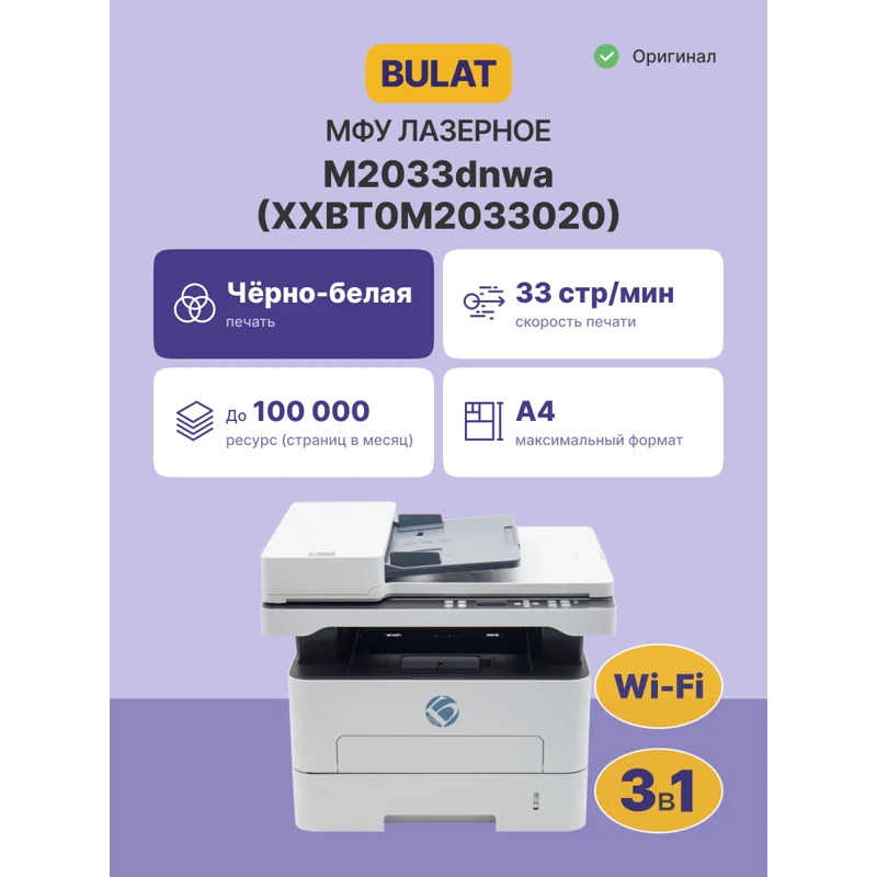 МФУ BULAT M2033dnwa (модель XXBT0M2033020) представляет собой современное чёрно-белое лазерное устройство формата А4, объединяющее функции принтера, копира и сканера в одном компактном корпусе. Это оптимальное решение для офисных задач, требующих высокой производительности.