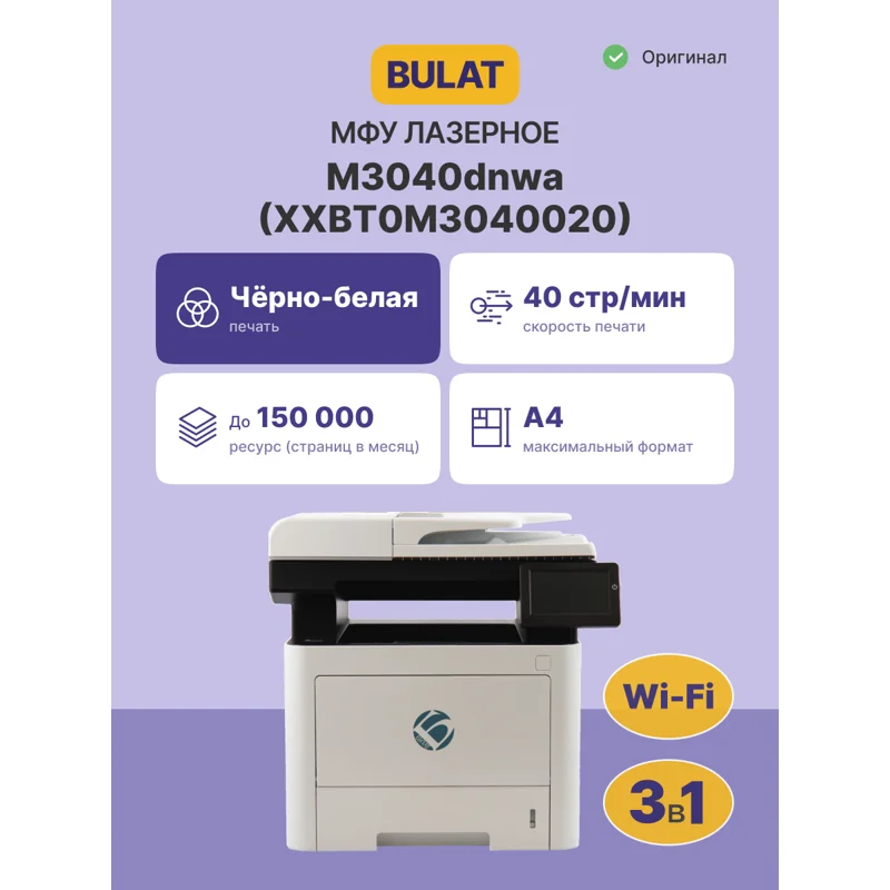 МФУ BULAT M3040dnwa (модель XXBT0M3040020) представляет собой многофункциональное устройство, объединяющее функции принтера, копира и сканера в одном компактном корпусе. Это современное решение для офисных задач, обеспечивающее высокую производительность и надёжность.