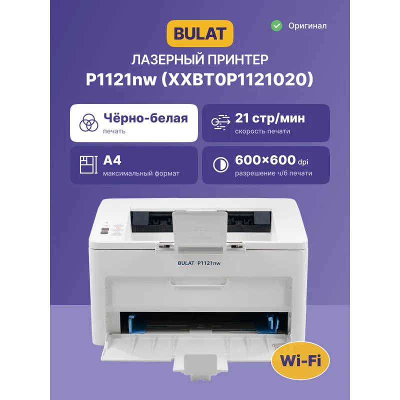 BULAT P1121w — это лазерный монохромный принтер, предназначенный для офисного использования. Он сочетает в себе высокую производительность, надежность и экономичность, что делает его отличным выбором для небольших офисов и домашних пользователей.